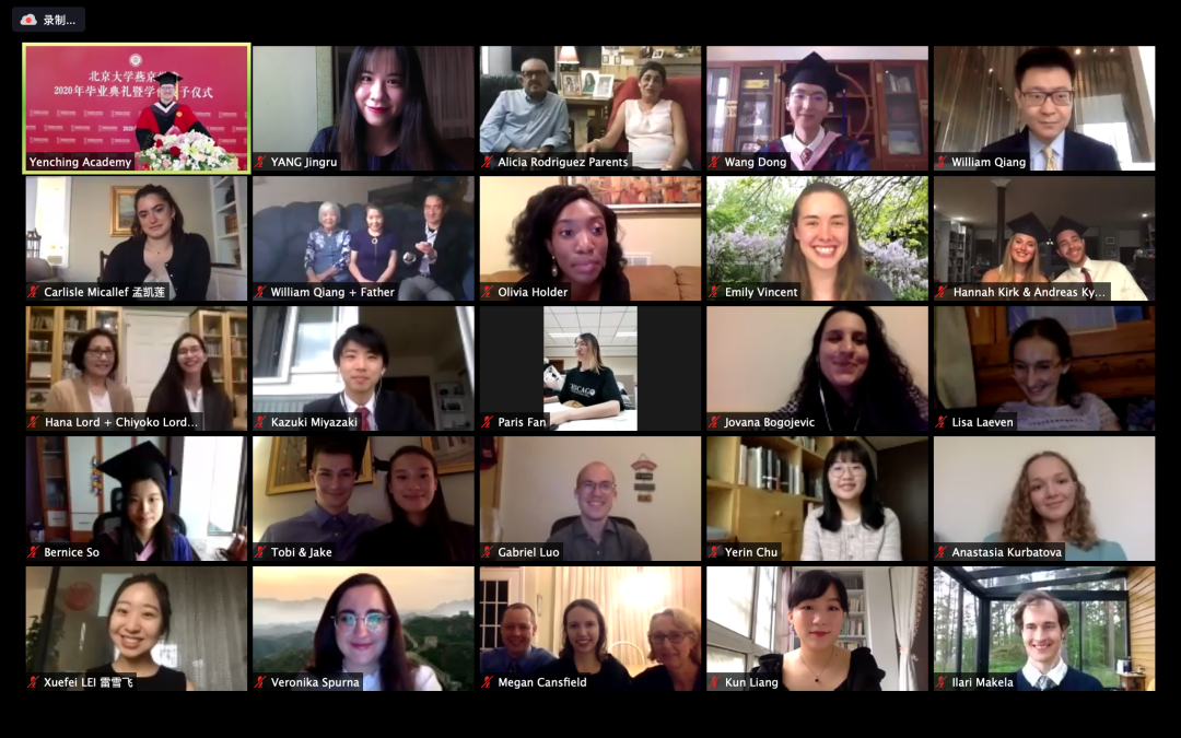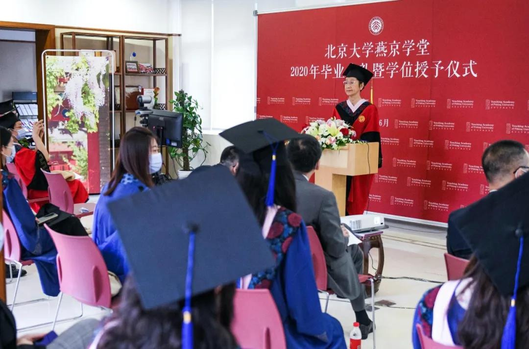 On June 29th, 2020, the Yenching Academy of Peking University held a memorable joint online and offline Graduation Ceremony for its 2020 graduates. Wang Bo, Vice President of Peking University sent his blessings to the students in a video message. Yuan Ming, Dean of the Yenching Academy, Associate Dean Fan Shiming, Director of Graduate Studies, Lu Yang, Assistant Dean Chen Changwei, and Associate Professor of School of International Studies Liu Haifang all attended this event. 12 graduates were also in attendance, while the rest of the graduates participated online through Zoom. Brent Haas, Director of Admissions Affairs, hosted the ceremony.