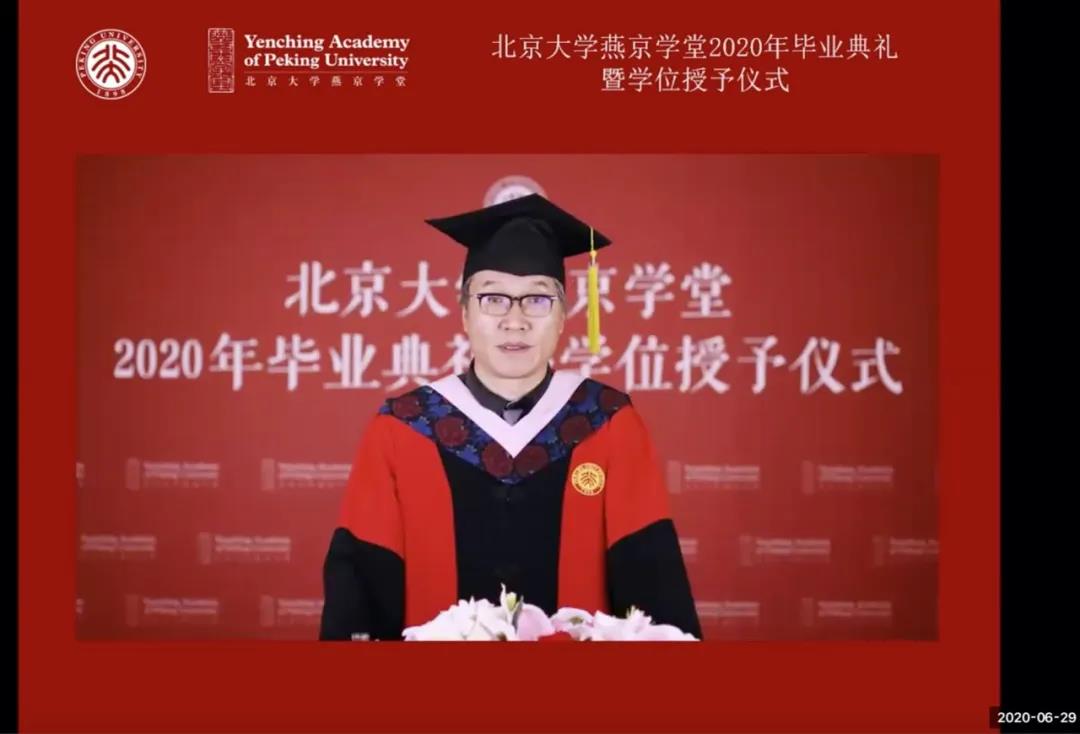 After Dr. Haas’s speech, Vice President Wang Bo began his video message by noting that Yenching Scholars helped Peking University become a more open and diverse community. When facing this worldwide epidemic, he urged young scholars from all over the globe to make a greater effort to address the fear and distrust that characterizes current global affairs through cultural exchange. He then shared his three hopes for graduates; first, to equip themselves with knowledge to keep apace with the times; second, to remain true to themselves and speak honestly and assume responsibility even when things are hard; and third, to be compassionate and kind, because these are the qualities that will help them to go a long way. He also urged graduates to become better people, care about the world around themselves and beyond, and give back to society.