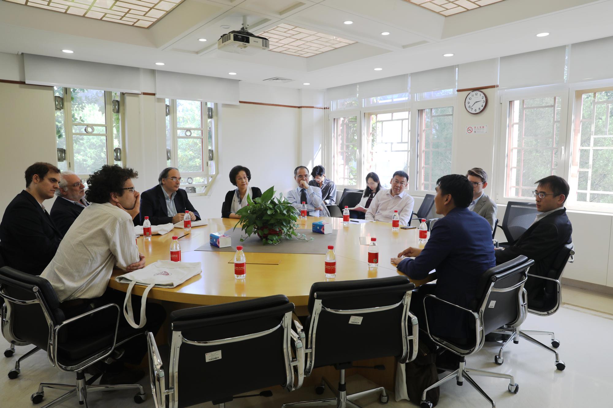 On the afternoon of September 20, the Academy hosted a visiting delegation of scholars from the Accademia Vivarium Novum, an institute of classical languages, literature, philosophy, and history in Rome. Dean Luigi Miraglia of the Accademia, accompanied by Vice Dean Ignacio Armella Chavez, Professor Giancarlo Rinaldi, and Professor Özséb Áron Tóth, met with Dean Yuan Ming of Yenching Academy, Associate Dean Fan Shiming, Professor Peng Xiaoyu, and other representatives from Peking University. Also present was Ng Junyang, a 2018 graduate of Yenching and a former student at the Accademia.