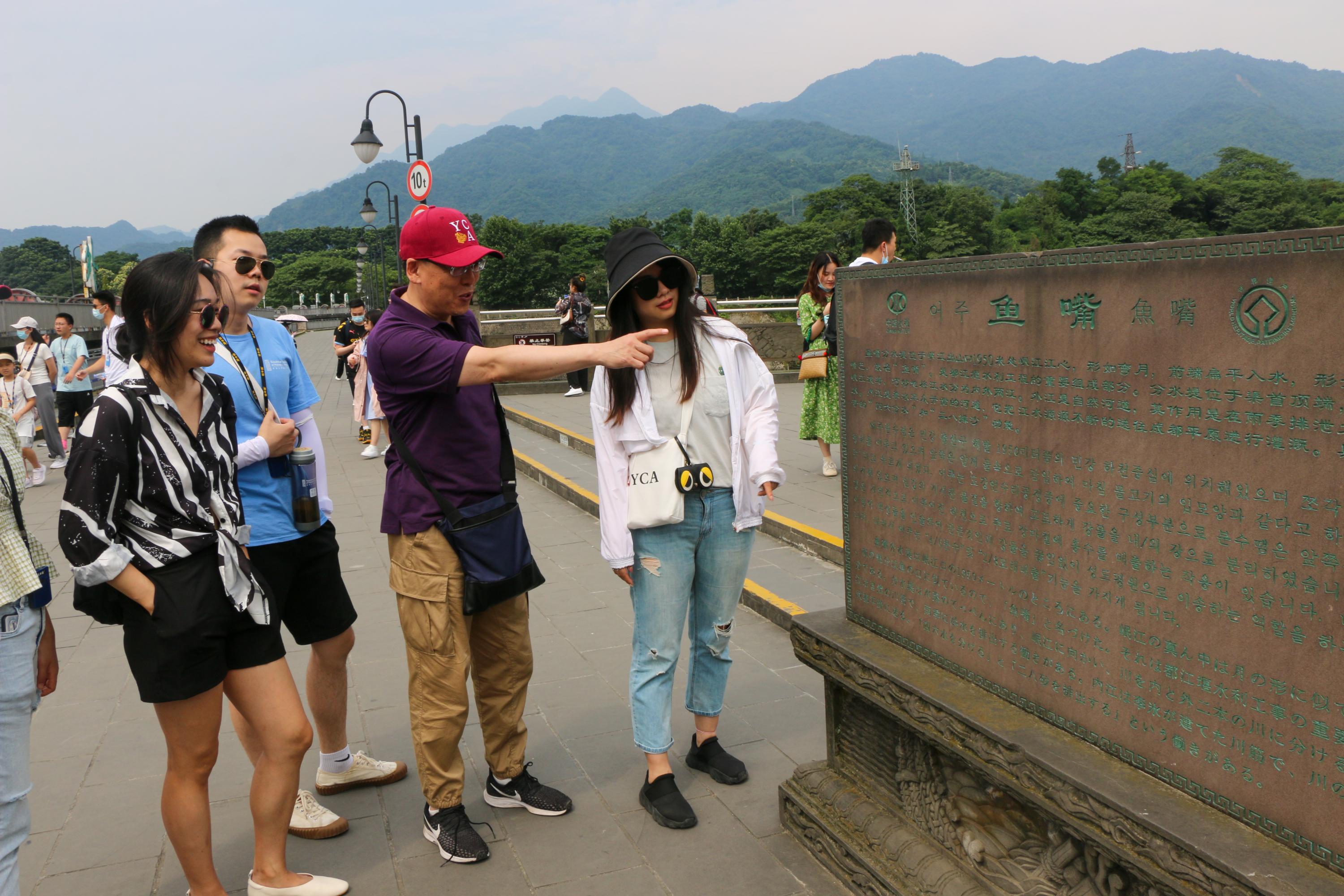 Furthermore, the group visited the Dujiangyan Irrigation System, a UNESCO World Heritage site and the world's oldest in-use diversion project without a dam. The Scholars looked in awe and listened with attentive ears as the tour guide narrated the history of the over 2200-year-old wonder of the world. Built by Li Bing during the Qin Dynasty, the irrigation system was designed to protect the city against floods and drought. The Scholars explored the famous Anlan Suspension Bridge and took photographs of the various water projects and the surrounding temples and mountains.