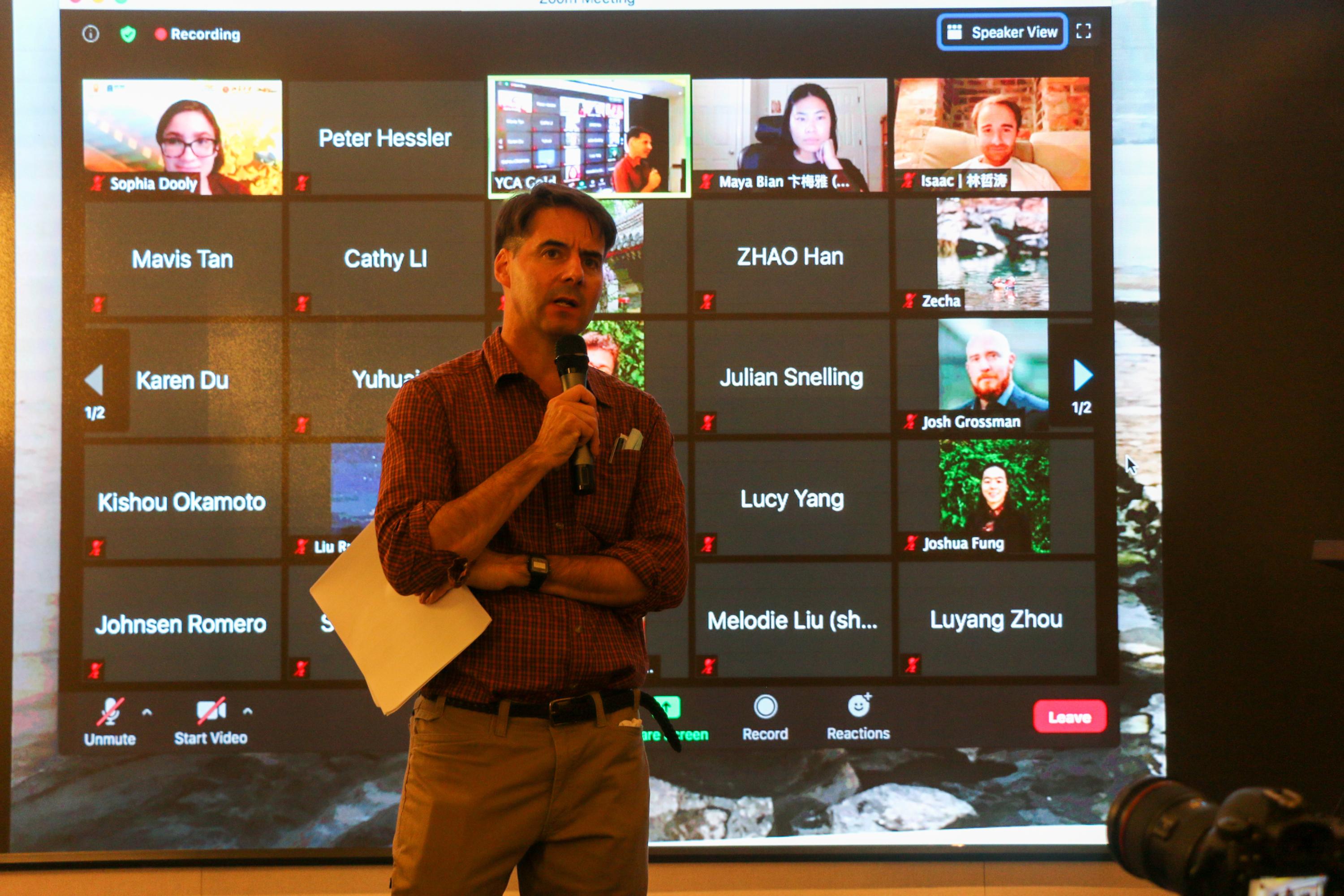 Peter Hessler, the American writer and journalist, delivered a lecture to the students. Although onsite, overseas resident Scholars joined the lecture online. Peter talked about his work as a Peace Corps teacher in Fuling and how the area developed over the years. He also discussed his latest research centered on discovering the changes in the perception of religious beliefs, economic development, and the government's role among Chinese people. The students onsite and online raised several questions, including questions to understand his reason for choosing China, research methods, and how he had changed vis-à-vis Fuling's transformation.