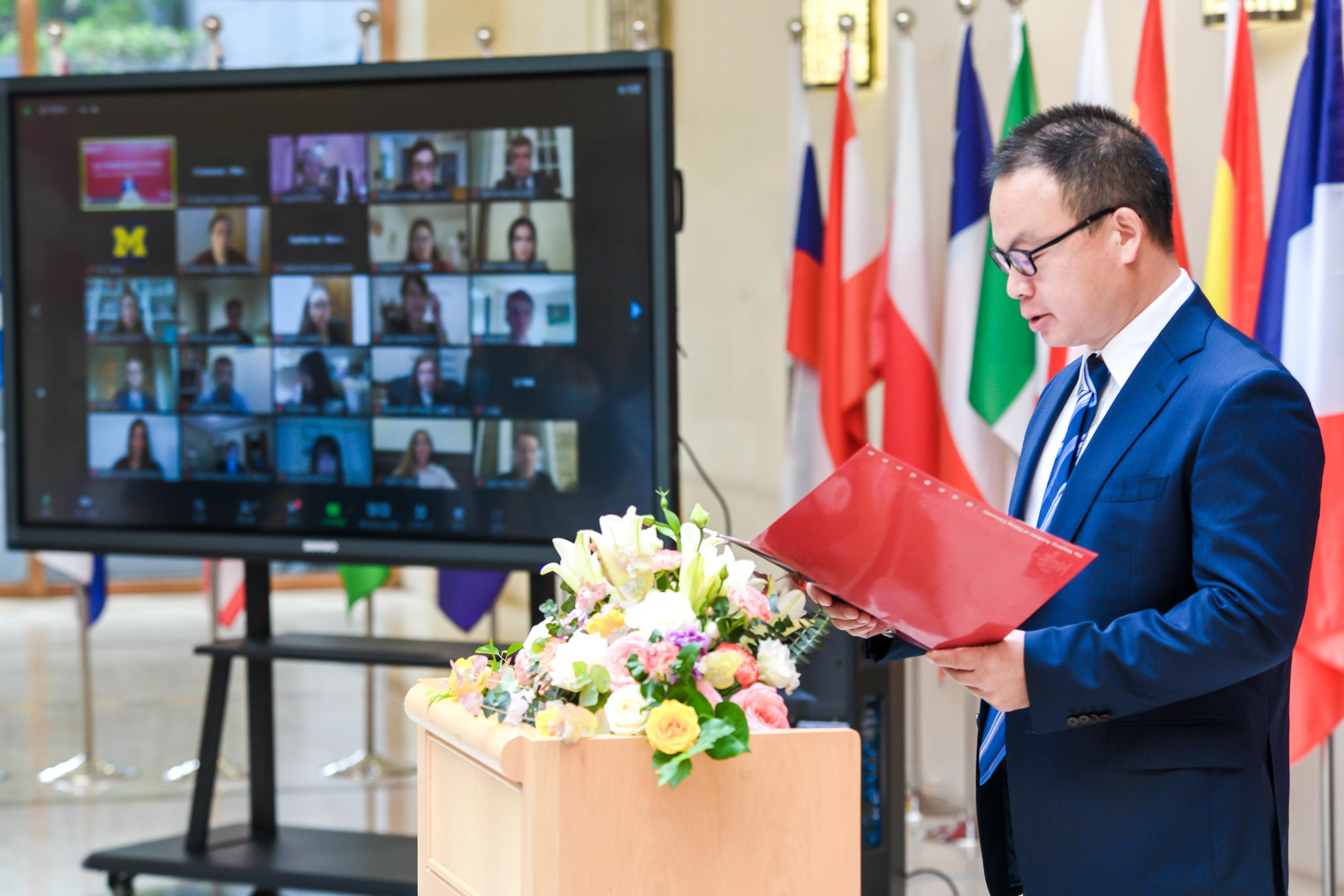 Nguyen Dang Dao, a 2021 Yenching Scholar from Vietnam, delivered a students' representative speech. He expressed his delight for being among the seventh cohort, recounting his academic journey from getting a PKU undergraduate scholarship in 2018 to studying for a master's degree in Europe. He stressed that his choice of YCA stemmed from the academic program's core character of building bridges to connect peoples and perspectives and foster cross-cultural communication and friendships transcending borders. "Many dichotomies still exist, and COVID-19 has intensified them, as it is easier to categorize and simplify everything instead of carefully looking into the beauty of each and trying to understand everything from various perspectives." Dao believes this thought system has given him a renewed purpose to "become a bridge builder."