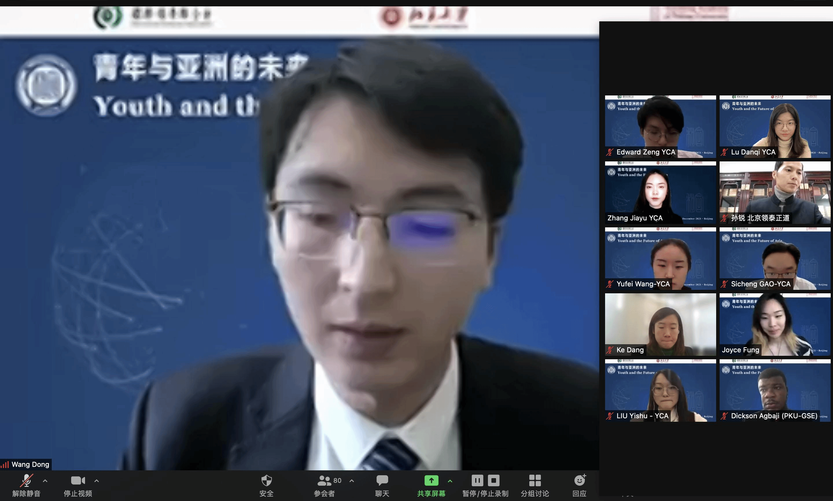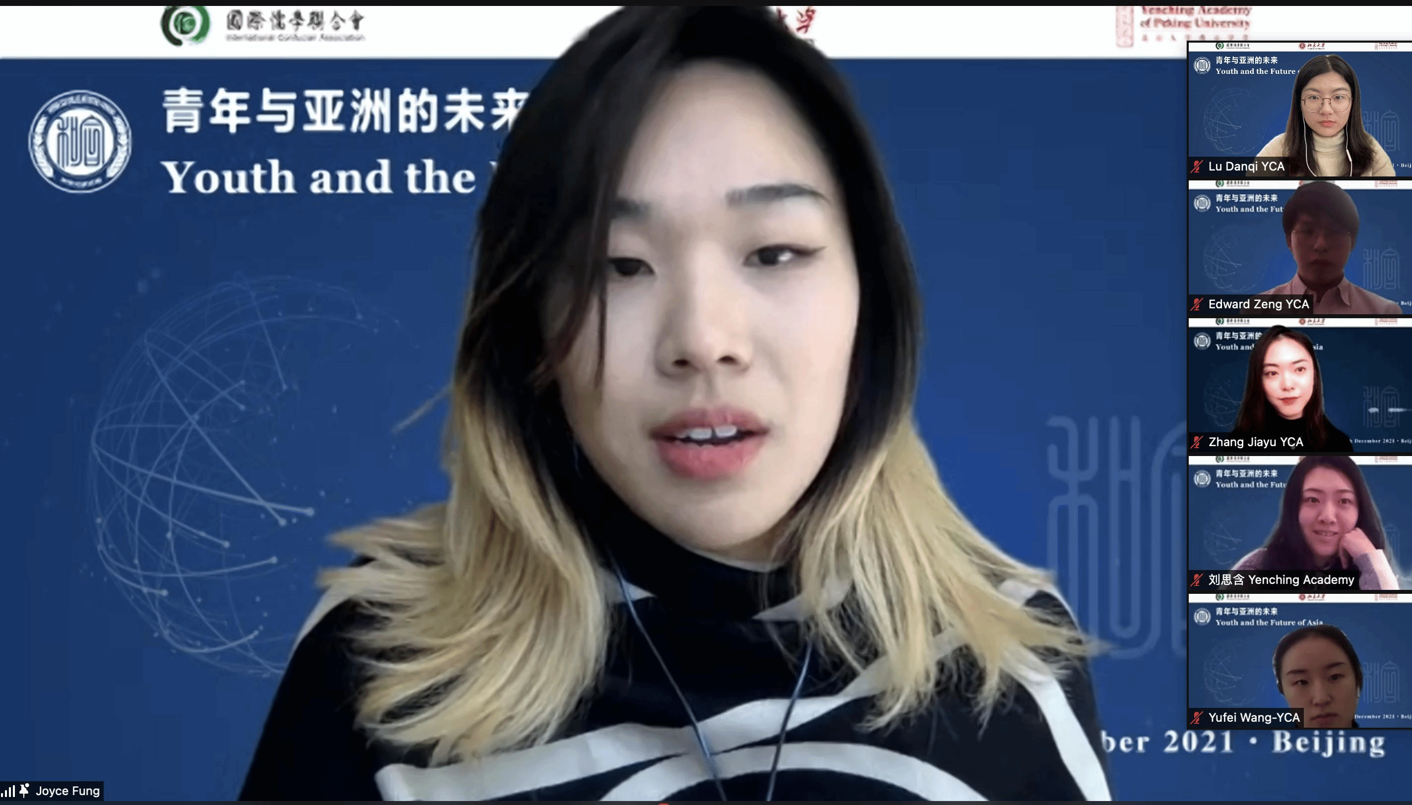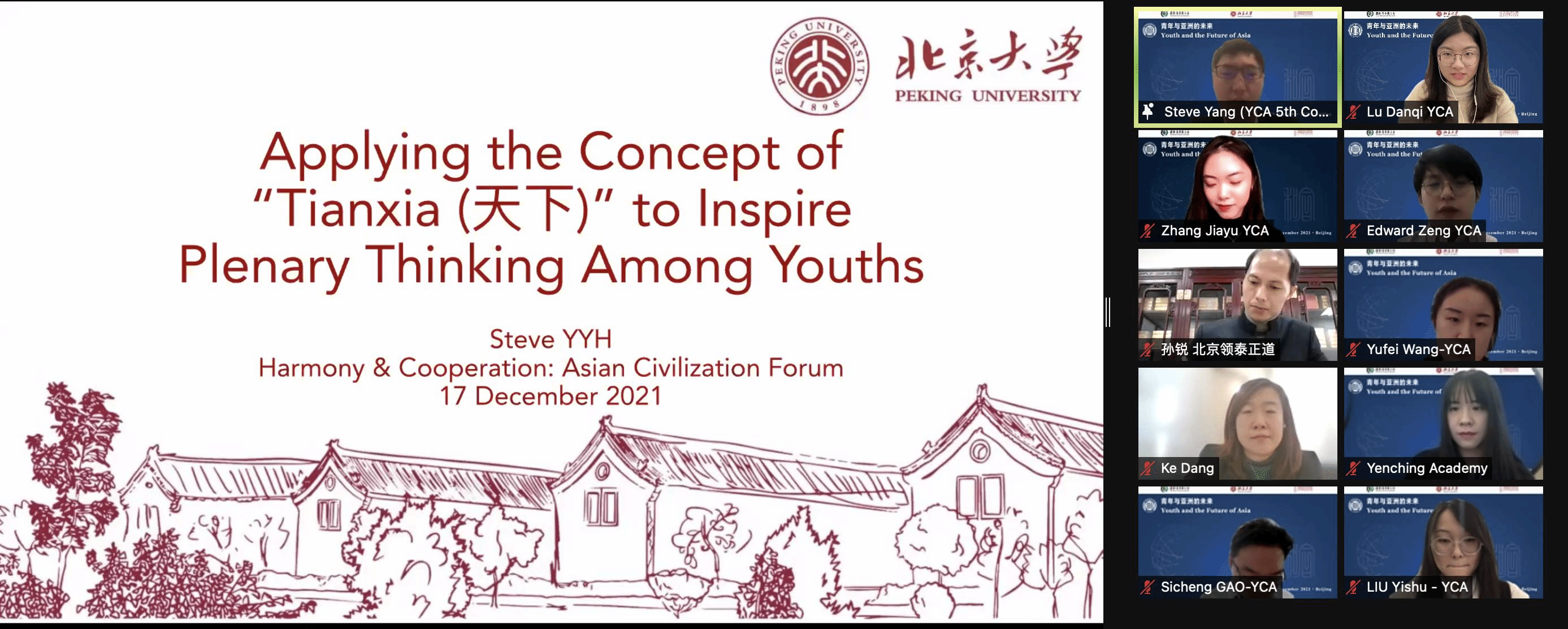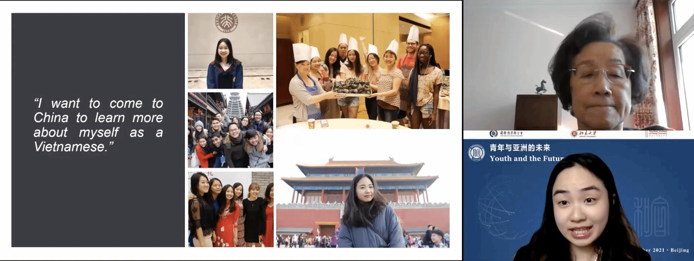 In the afternoon, the Yenching Academy launched an online meeting, “Youth and the Future of Asia,” consisting of two parts, "Plenary: The Growth of Young Generation" and "Discussion: The Innovation of Young Generations". Zhang Jiayu, 2021 Yenching Scholar from China, presided over the sessions.