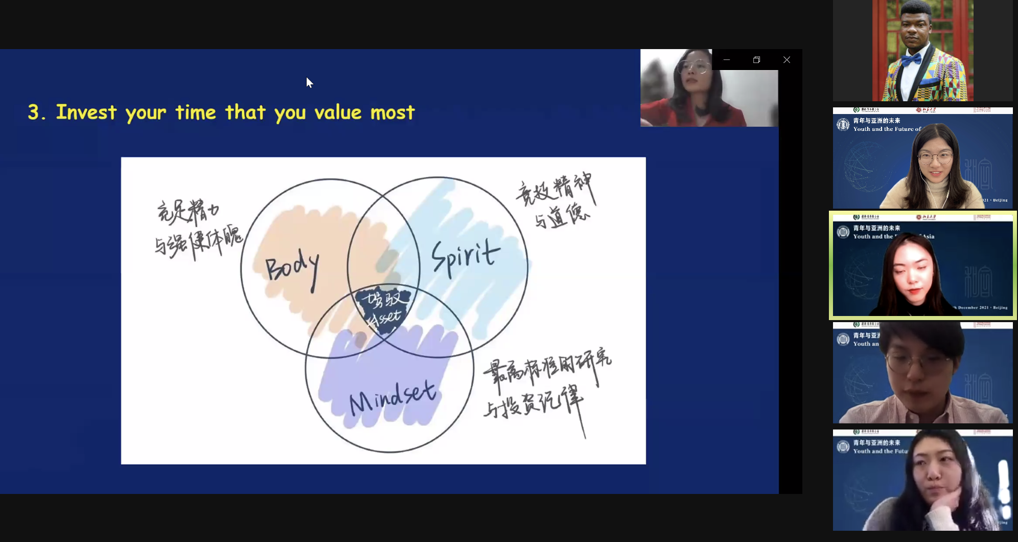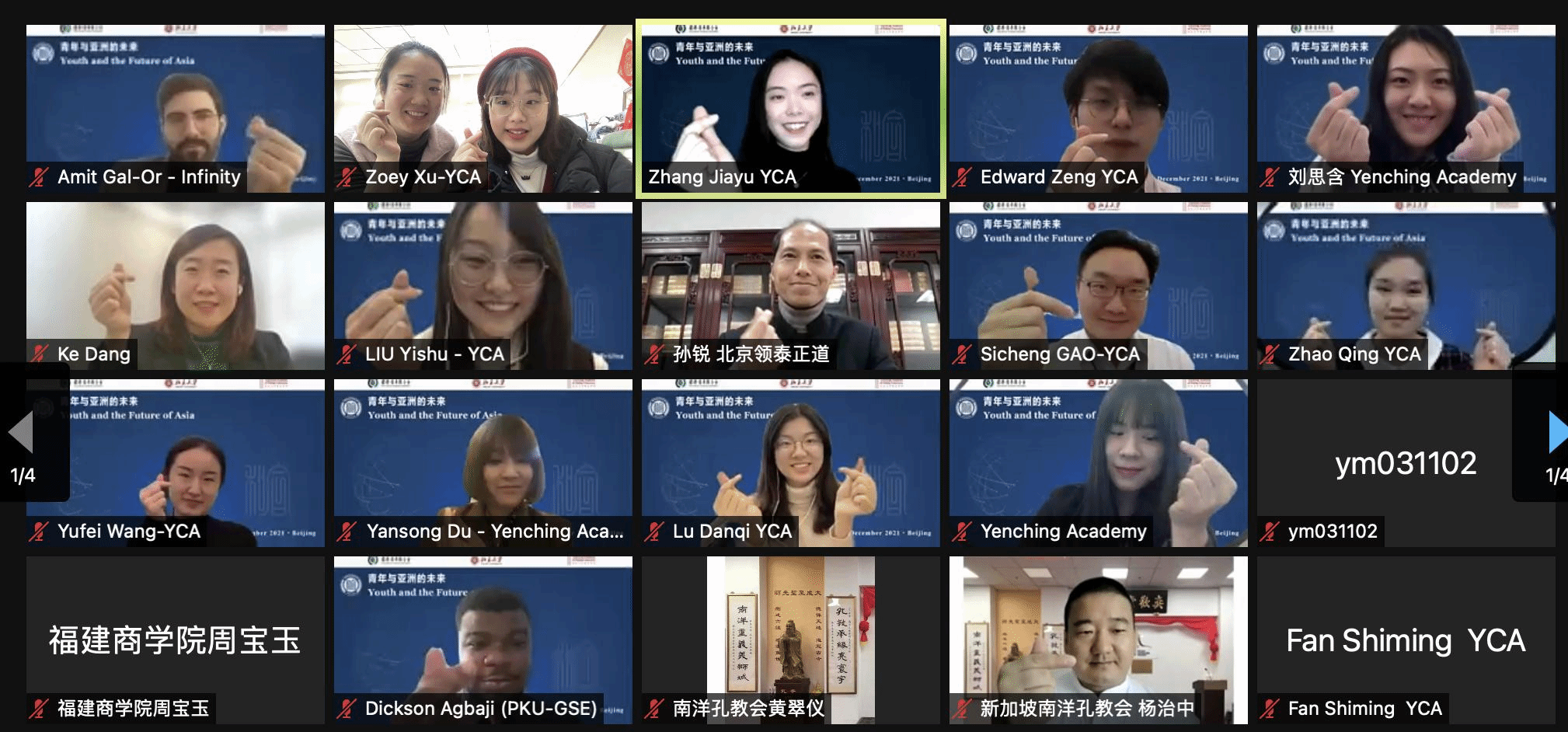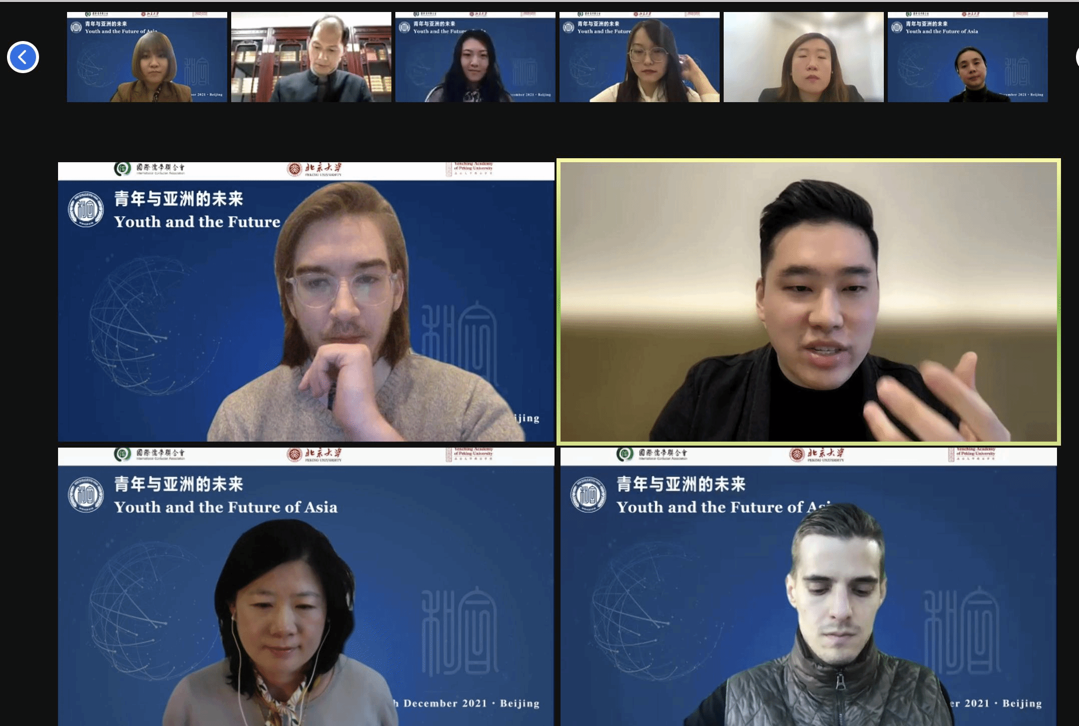 In the afternoon, the Yenching Academy launched an online meeting, “Youth and the Future of Asia,” consisting of two parts, "Plenary: The Growth of Young Generation" and "Discussion: The Innovation of Young Generations". Zhang Jiayu, 2021 Yenching Scholar from China, presided over the sessions.