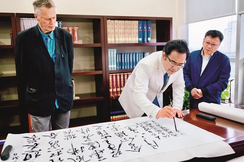 Dong Qiang writes Li Bai's poem in calligraphy while communicating Tang poetry with Jean-Marie Gustave Le Clézio, a famous French writer and Nobel laureate in literature.