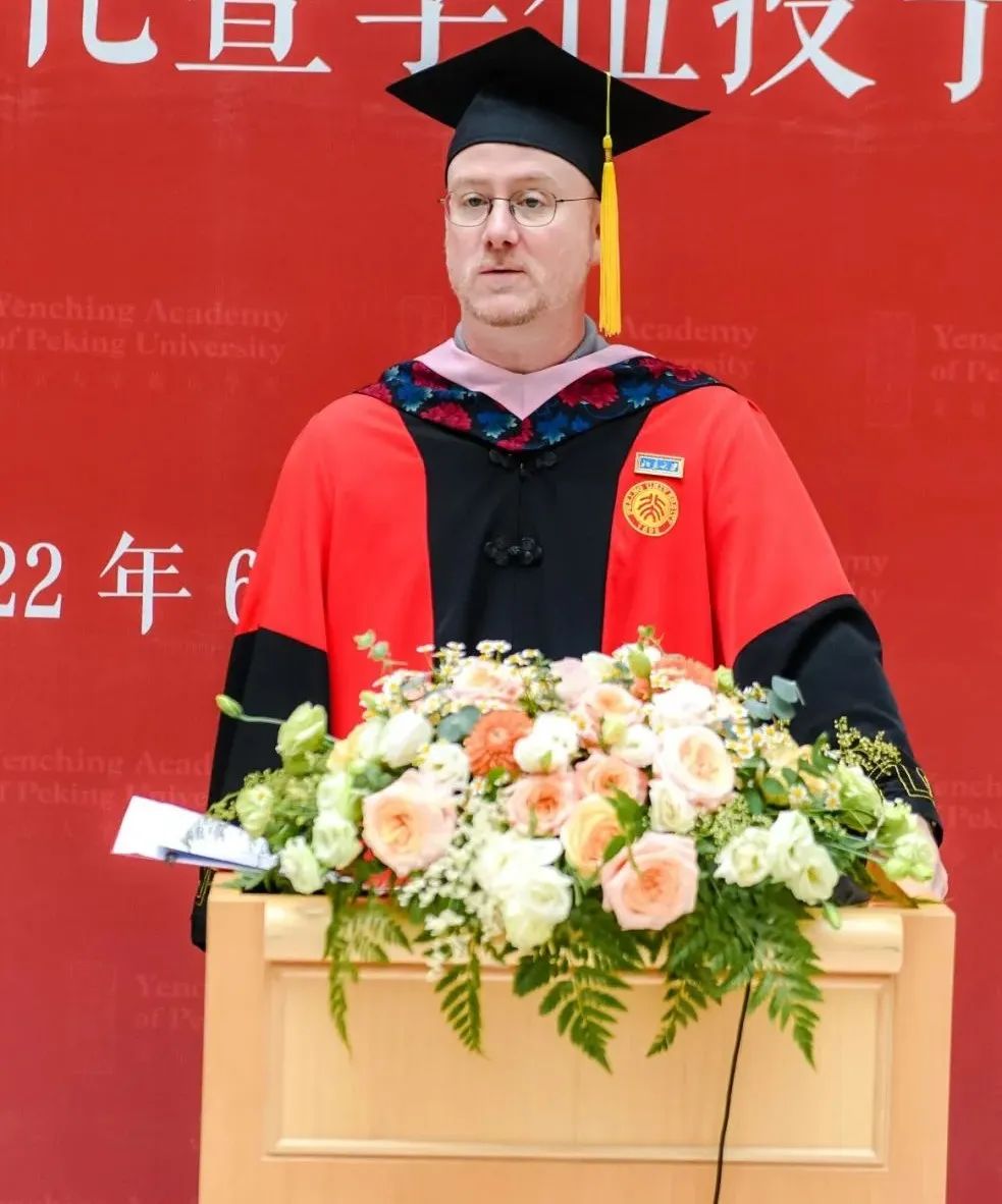 Associate Dean Brent Haas delivered an opening remark, welcoming all present, congratulating the graduates, and reflecting on the mutually constituted relationship between dream and reality. He drew on a lyric – “The future is not what it used to be” – from one of his favorite songs, Black Gold, by Foals, to describe the experience of this class of Yenching Scholars. Having applied to YCA before the pandemic, the 6th cohort’s experience was deeply affected by Covid-19 and resulting travel restrictions. Nevertheless, Dr. Haas noted his deep admiration for the Scholars’ adaptability, kindness, and resilience in the face of the challenges caused by the pandemic.