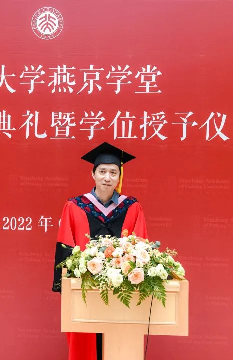 Yenching Academy Director of Graduate Studies Lu Yang gave a speech as the faculty representative, expressing profound congratulations to the class of 2022 and his regret for many Scholars’ inability to study on campus. Prof. Lu recounted an old Chinese saying, “One can see what a child is like at the age of eight when it reaches the third year, and determine what the whole life would be like when it reaches eight,” noting the Academy’s steady growth in eight years. Nonetheless, he added that the challenges of the last two years have been unprecedented and have taken a toll on people in China and beyond. He shared his experience living on campus owing to the University’s pandemic management scheme, discussing his joy to find high spirit among staff and students and the beautiful scenery of the PKU campus, including the Weiming Lake and birds flying and singing over the traditional courtyard. Lastly, Prof. Lu hoped that the Scholars would be able to visit the campus sometime in the future when the opportunity presents itself.