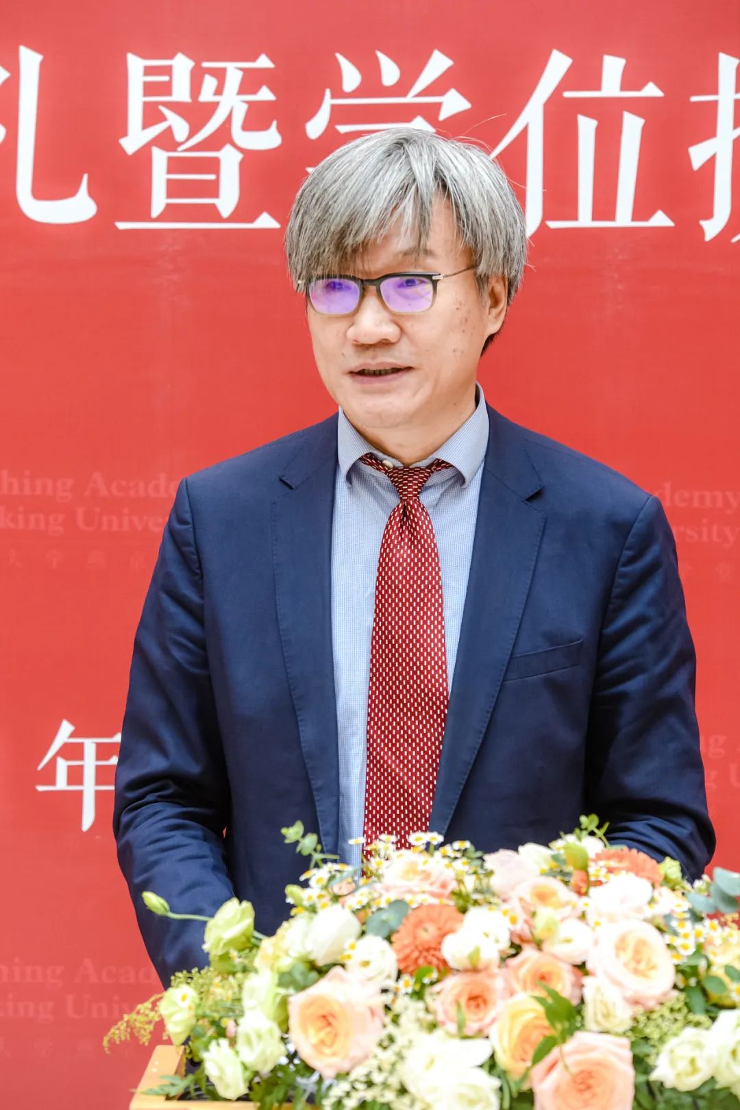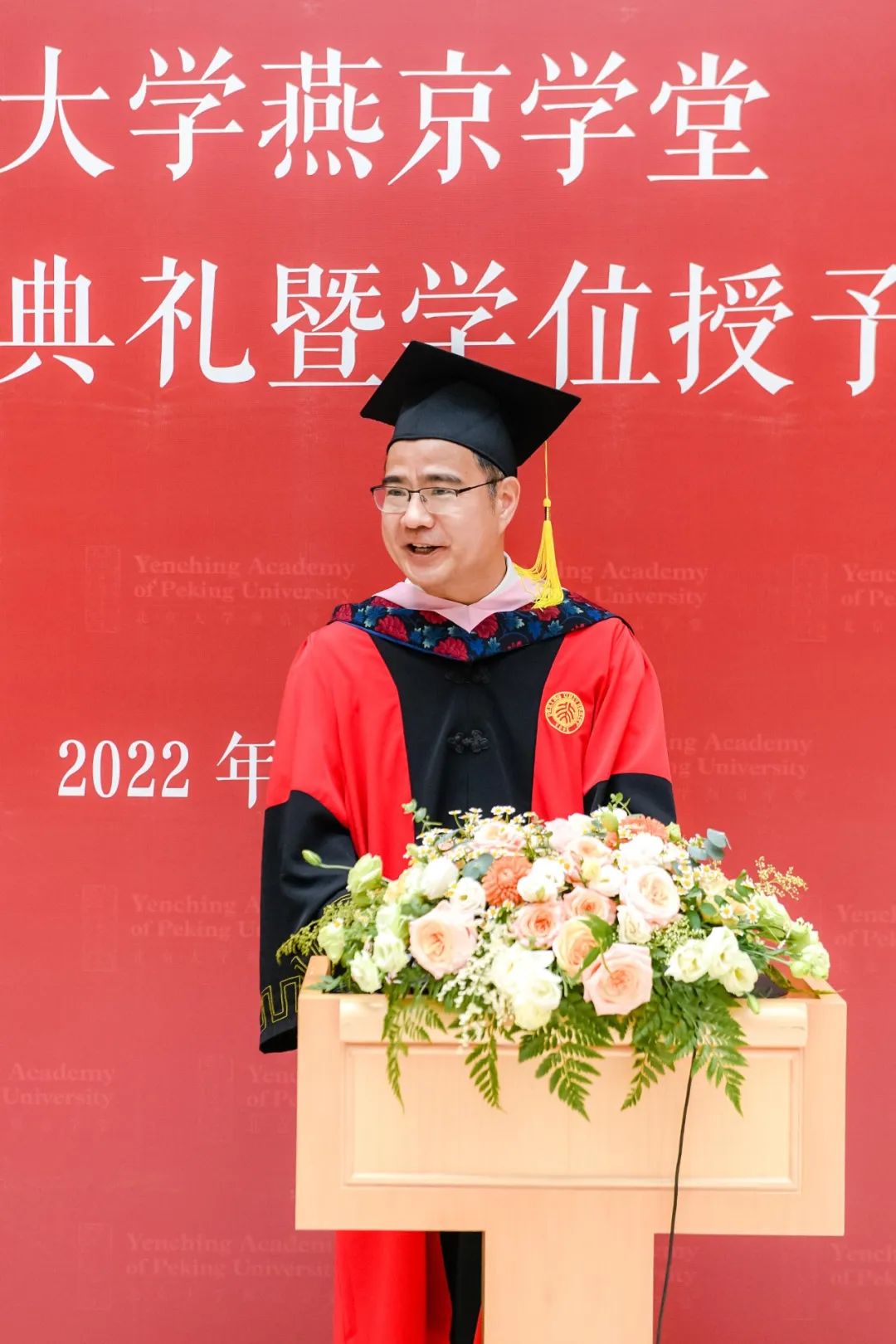 Prof. Wang Bo also delivered a speech. He congratulated the class of 2022 for their perseverance in undertaking their studies, despite being unable to enter China and leave their mark on the PKU campus like other cohorts before them. The Vice President shared the philosophical ideas from the Book of Changes, stressing that the end of one journey is the start of the next. He also expressed gratitude to Yenching Scholars for the postcards and flowers he received while on campus during the pandemic prevention and management, noting the feeling of warmth and joy the gifts brought him.