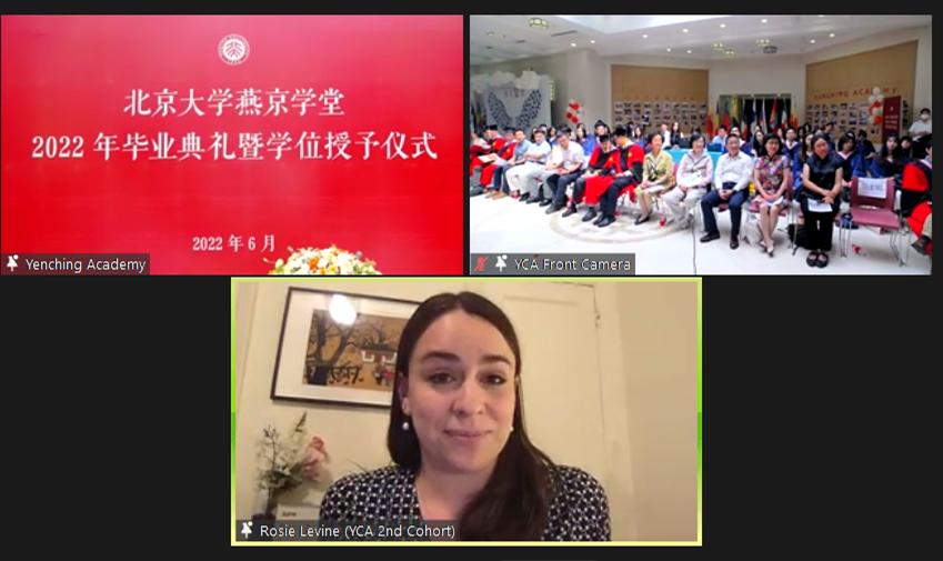 A representative of the Yenching Academy alumni network, Rosie Levine, a second cohort Yenching Academy Scholar and Senior Programs officer at the National Committee on US-China Relations, addressed the graduating class of 2022. Rosie shared her experience studying at Yenching Academy, noting that her classmates and YCA course helped her develop a deeper understanding of China, which has informed her work at the National Committee on US-China Relations. She also applauded the sixth cohort Scholars for their dedication to completing their coursework and research and graduating under the stressful condition of a global pandemic. She wished the graduating Scholars success in their future endeavors and hoped that Yenching Scholars could gather and study on campus soon to better learn about themselves and experience China.