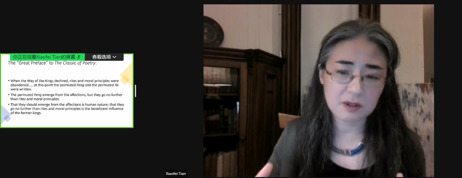 Professor Tian divided the lecture into three parts. She first began with the Classic of Poetry, discussing why poetry is essential to our understanding of Chinese cultural tradition. To facilitate a clearer comprehension of this age-old belief, she used quotes from Mencius, Book of Documents, and the Great Preface to the Classic of Poetry to explain the meaning of poetry and emphasize how poems can articulate the writers’ minds and change customs. Prof. Tian elaborated on two important points about the belief that The Classic of Poetry performs moral and political functions: music, which influences and teaches people; and free speech, which provides the opportunity to criticize the superior without being punished.