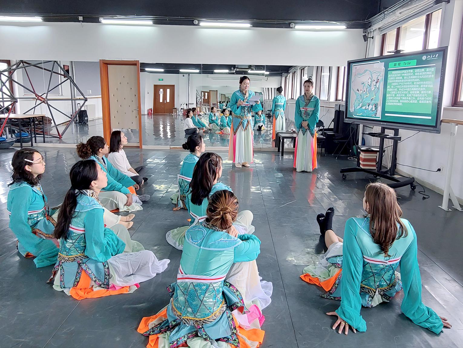 Tian Qing started the dancing workshop by introducing tage as an art form in ancient China, as depicted in brick reliefs, pottery figurines, and a scroll painted by Ma Yuan, a renowned early 13th-century Chinese painter. A dancer needs to pose in a way to have her body in “three curves”, with the shoulders drooping down, the head slightly bowed, and the arms, back, knees, and hips relaxed. Tian also distinguished classical Western dance from its Chinese counterpart. Classical ballet features turned-out positions of the legs, the opening of arms and legs, and the line of the extended legs. In contrast, classical Chinese dance gains beauty in movements like twisting, leaning, and curving of the body, legs, and arms. In a word, classical Western dance is open and outgoing, while the Chinese one is more reserved, as Western and Chinese cultures and arts differ.