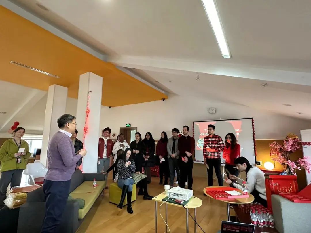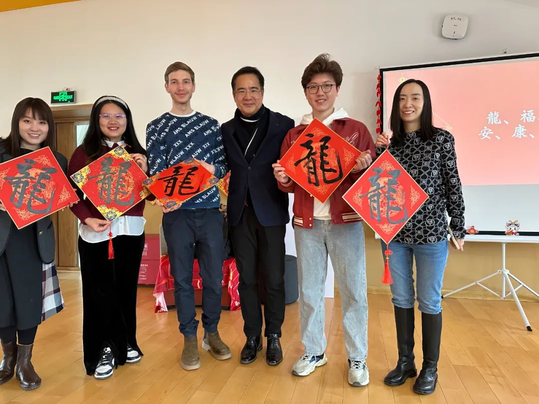 Dean Dong demonstrated the intricate strokes of writing the complex Chinese character “龍” through calligraphy, introducing international students to various styles of traditional Chinese calligraphy like official, running, and regular scripts. Fascinated by this ancient art form, students eagerly requested Dean Dong to teach them how to write while some tried their hand at calligraphy. Also, our international students created impressive “Happy New Year” posters written in different languages, each imbued with heartfelt joy. What’s more, they expressed good wishes for the New Year through their works of spring scrolls adorned with phrases like “Have Good Luck and Realize Your Hopes”, “With the Beginning of a New Year”, and “May All Your Wish Come True”.