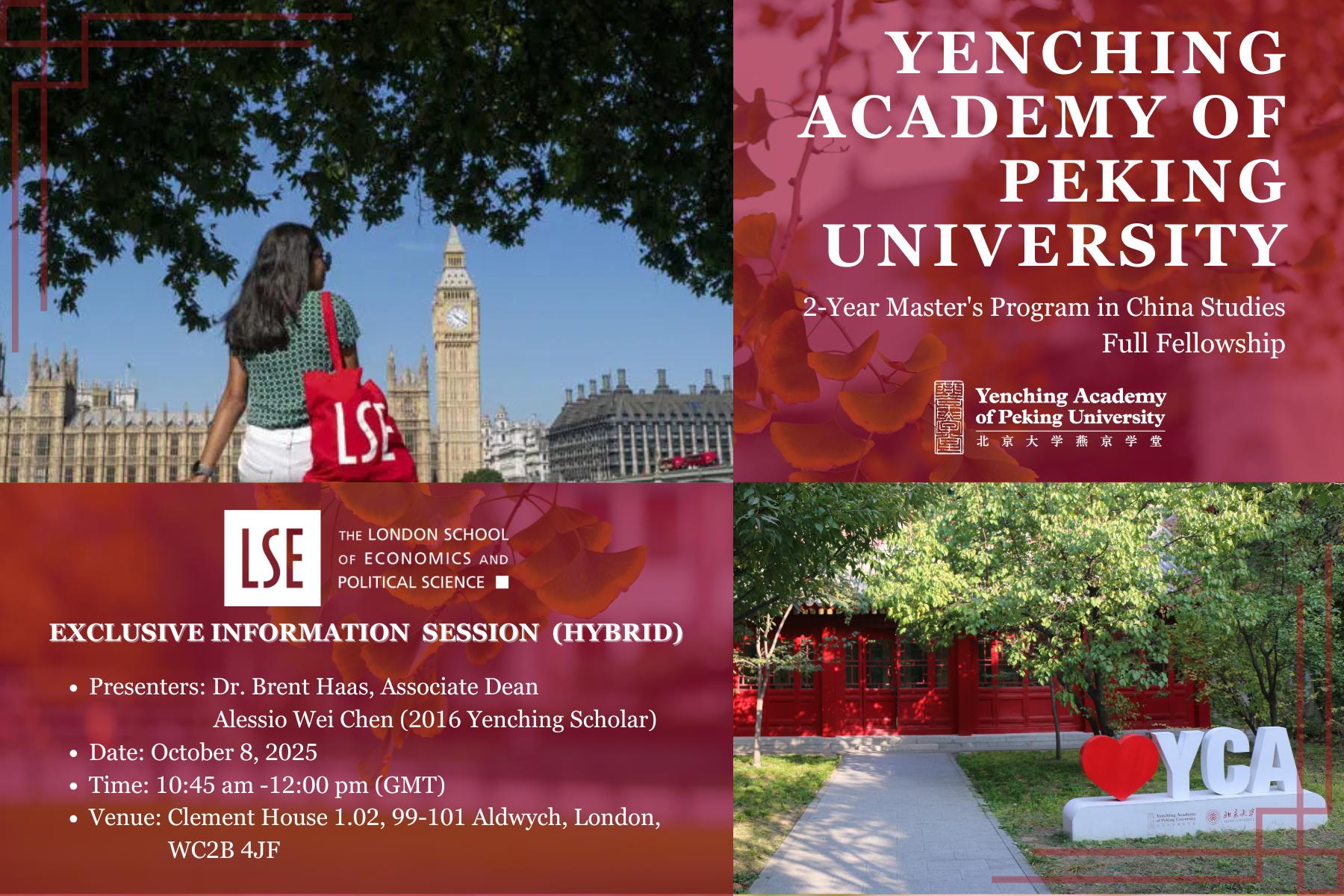 The Yenching Academy of Peking University will host an Exclusive Information Session at The London School of Economics and Political Science on October 8, 2025. The session will introduce our fully funded Master’s program in China Studies, a prestigious fellowship that brings together exceptional scholars from around the world, offering world-class training and immersive cultural experiences at one of China’s most distinguished institutions.