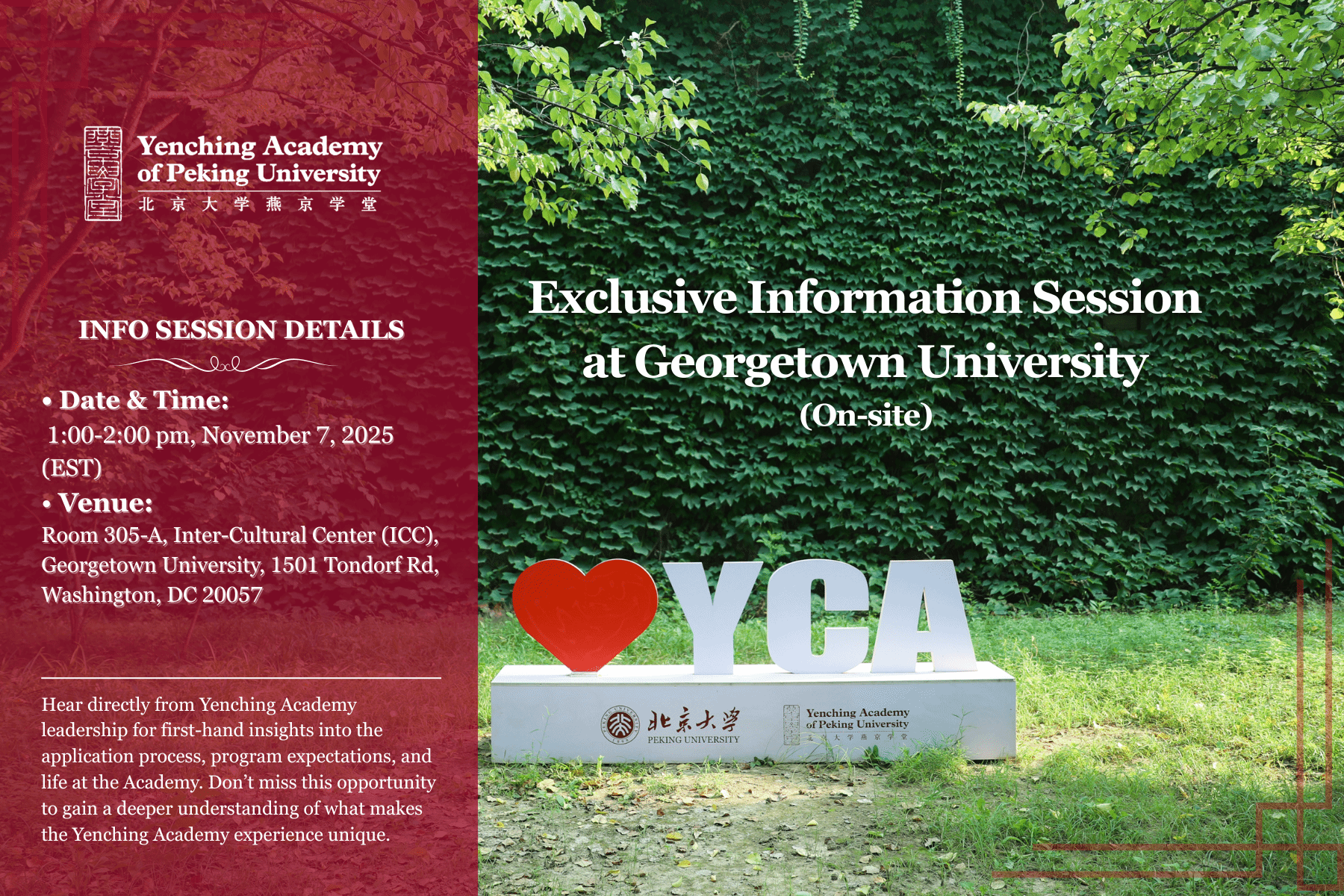 The Yenching Academy of Peking University will host an Exclusive Information Session at Georgetown University on November 7, 2025. The session will introduce our fully funded Master’s program in China Studies, a prestigious fellowship that brings together exceptional scholars from around the world, offering world-class training and immersive cultural experiences at one of China’s most distinguished institutions.
